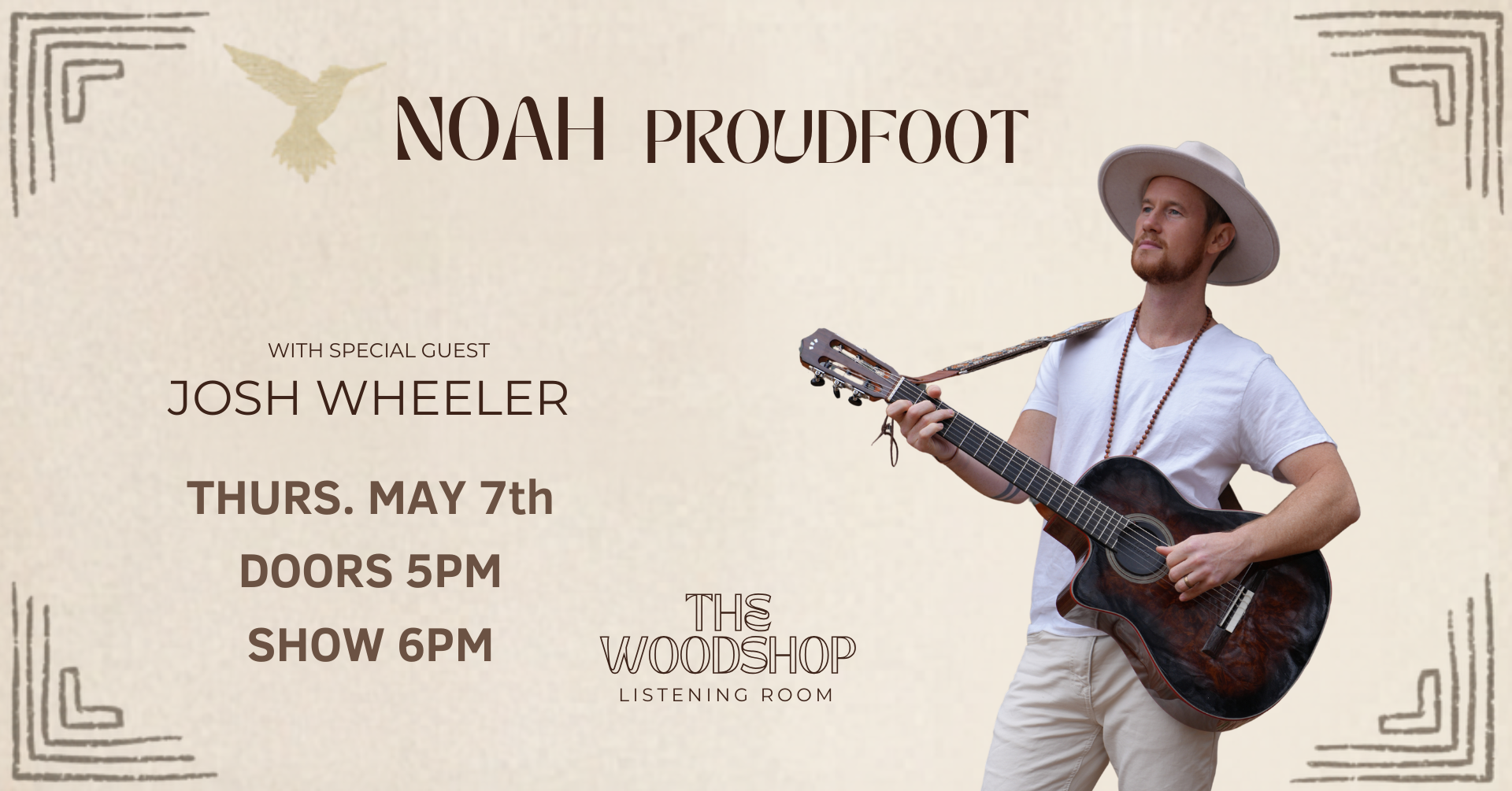Noah Proudfoot is a genre-blending singer-songwriter and multi-instrumentalist based in Asheville, North Carolina, whose music weaves together soulful vocals, poetic lyricism, and rhythmic acoustic guitar. Drawing from folk, world, and indie influences, his sound feels both grounded and transportive—inviting listeners into a space that’s equal parts introspective and uplifting. Touring across the country and internationally, Noah has built a devoted following through intimate performances that feel more like shared experiences than traditional shows. His background in poetry and literature comes through in his songwriting, giving each piece a strong sense of depth, intention, and emotional resonance. Now on tour promoting his third studio album, Noah makes his debut at The Woodshop Listening Room—bringing his blend of warmth, musicality, and presence to the stage for the first time in Chattanooga.